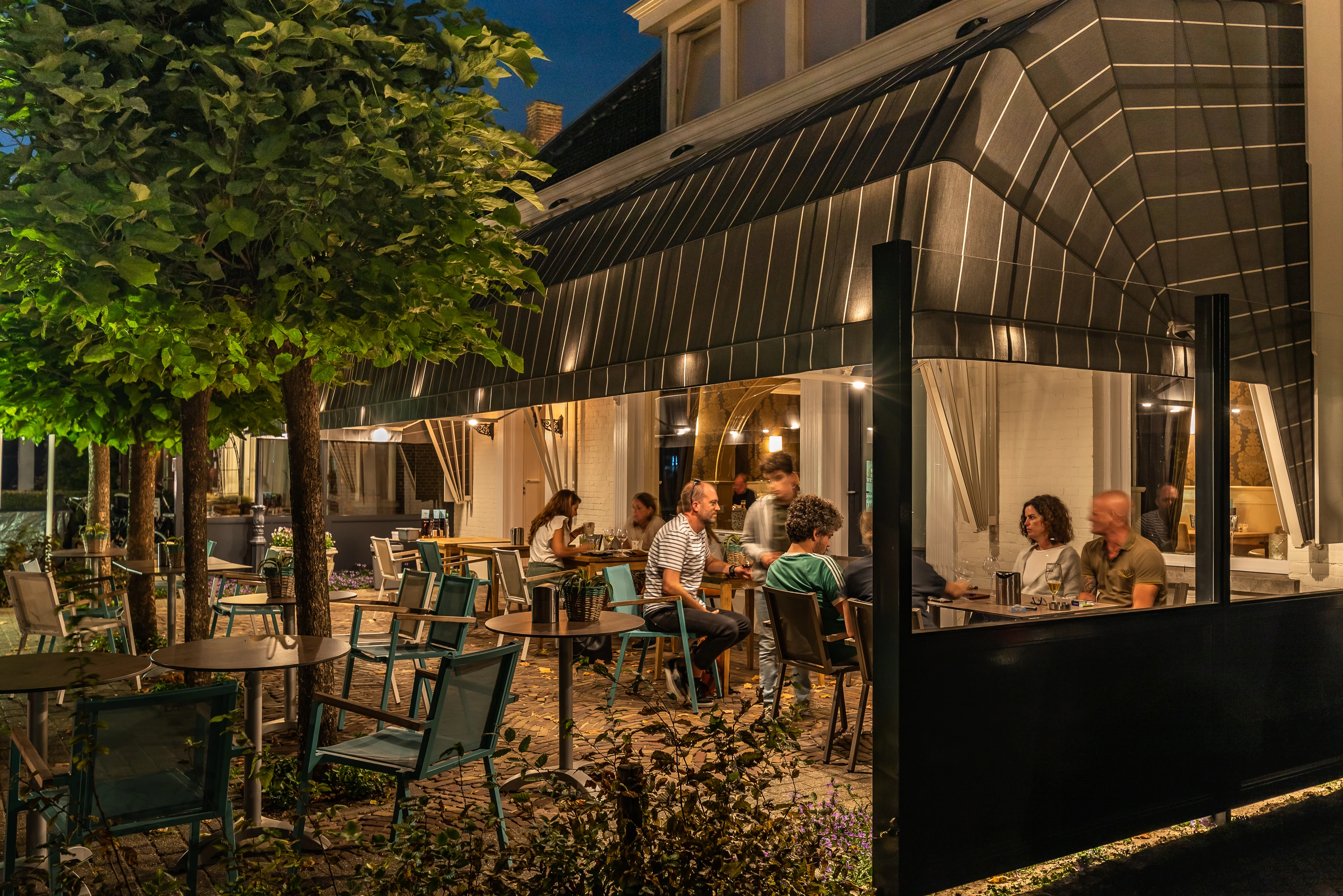 Op dit terras ontstaat een plek waar gasten op elk moment van de dag comfortabel kunnen zitten. Beschut tegen zon en wind, terwijl de open sfeer behouden blijft.
