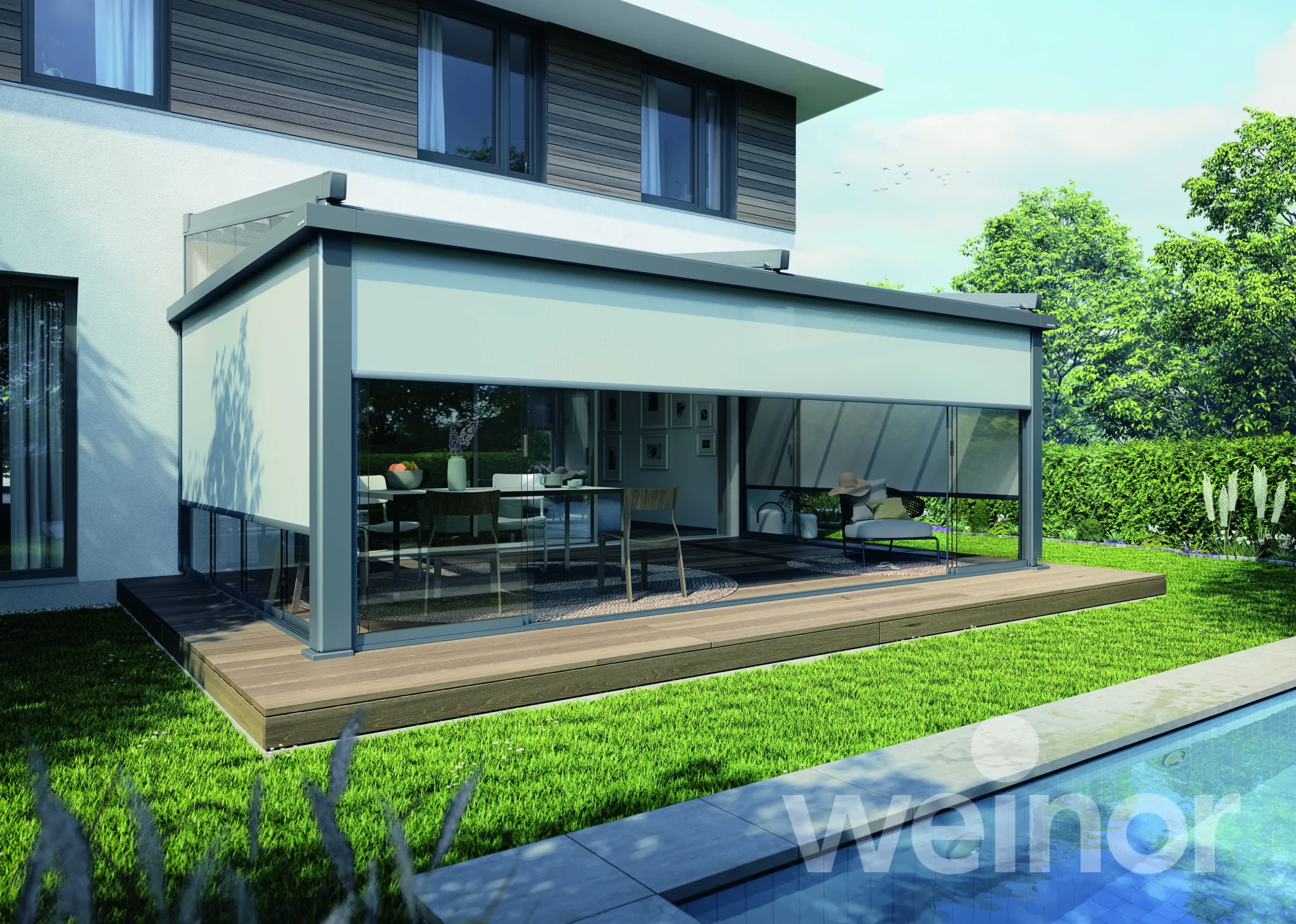 De screens sluiten de ruimte af wanneer dat nodig is en zorgen voor een aangenaam klimaat. Zon, wind en inkijk worden verminderd, terwijl het contact met buiten behouden blijft. Dankzij de kwaliteit van Weinor ontstaat een duurzame oplossing die perfect aansluit op de woning.